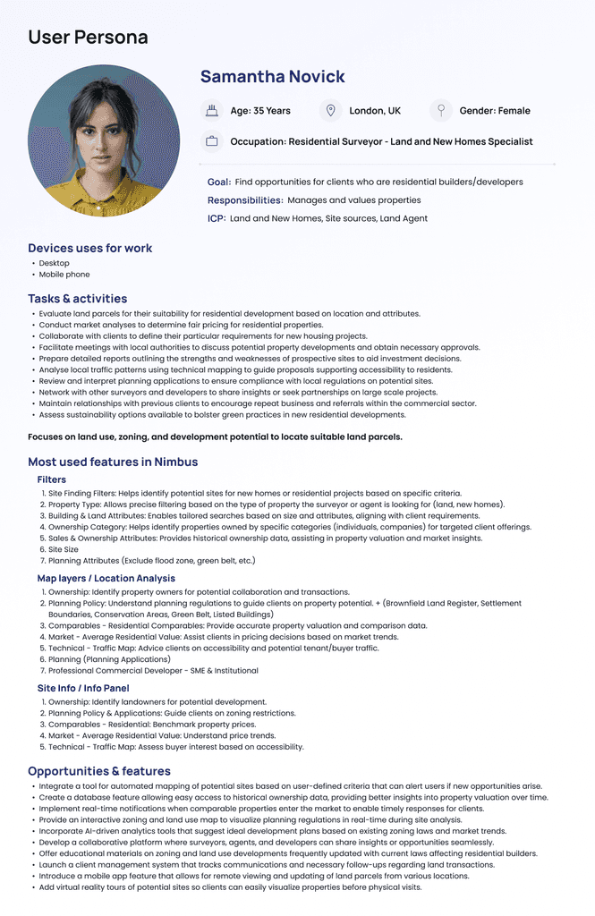 User Interviews: Conducted 30+ interviews with seven personas (e.g., property developers, surveyors, investors) to understand workflows and pain points.